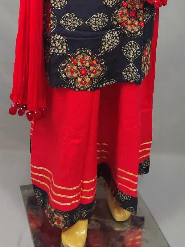 Wear it at any festival and it will make you outshine. This beautiful set has all-over mirror work on front and with matching palazzo and dupatta.