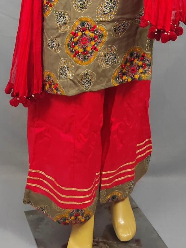 Wear it at any festival and it will make you outshine. This beautiful set has all-over mirror work on front and with matching palazzo and dupatta.